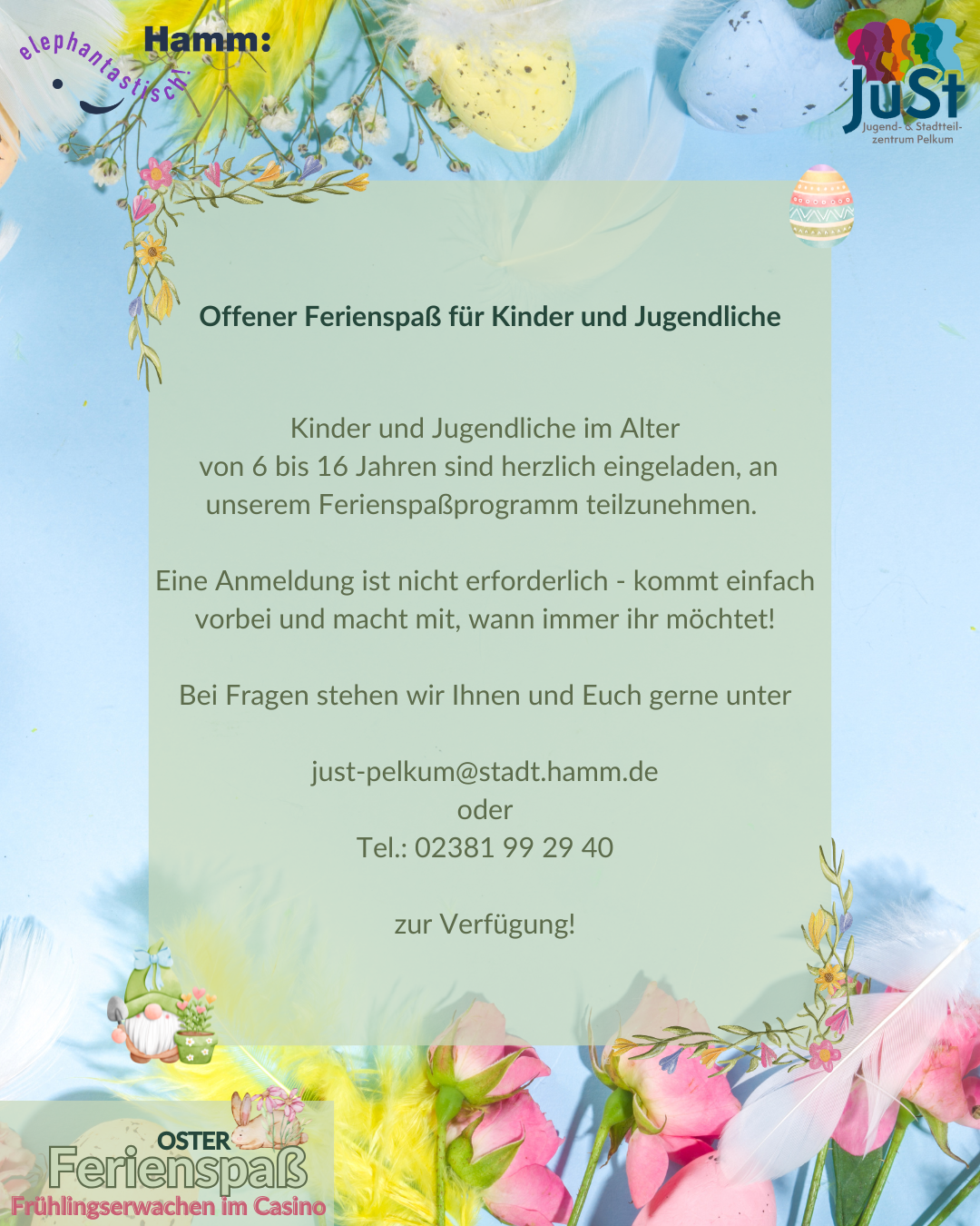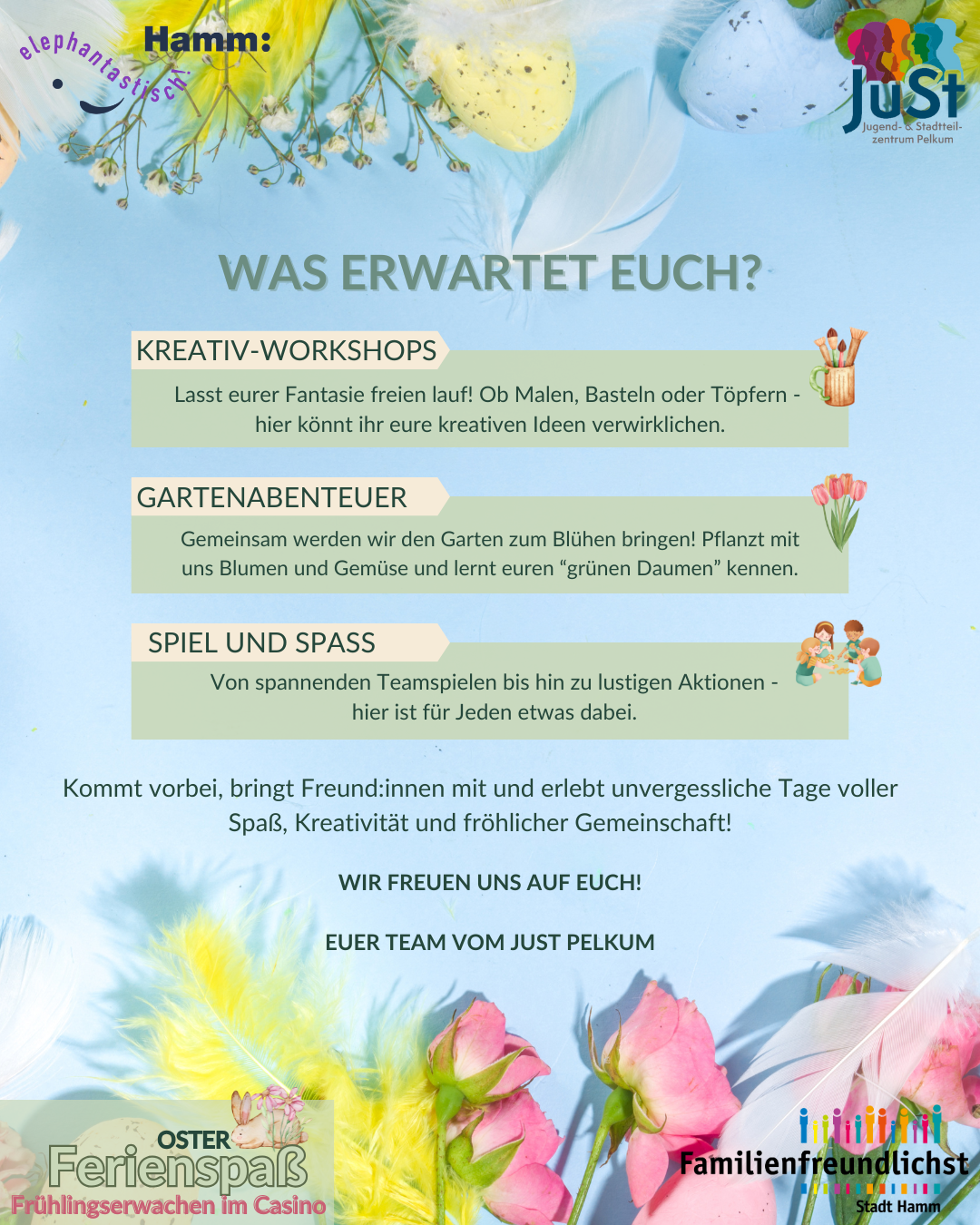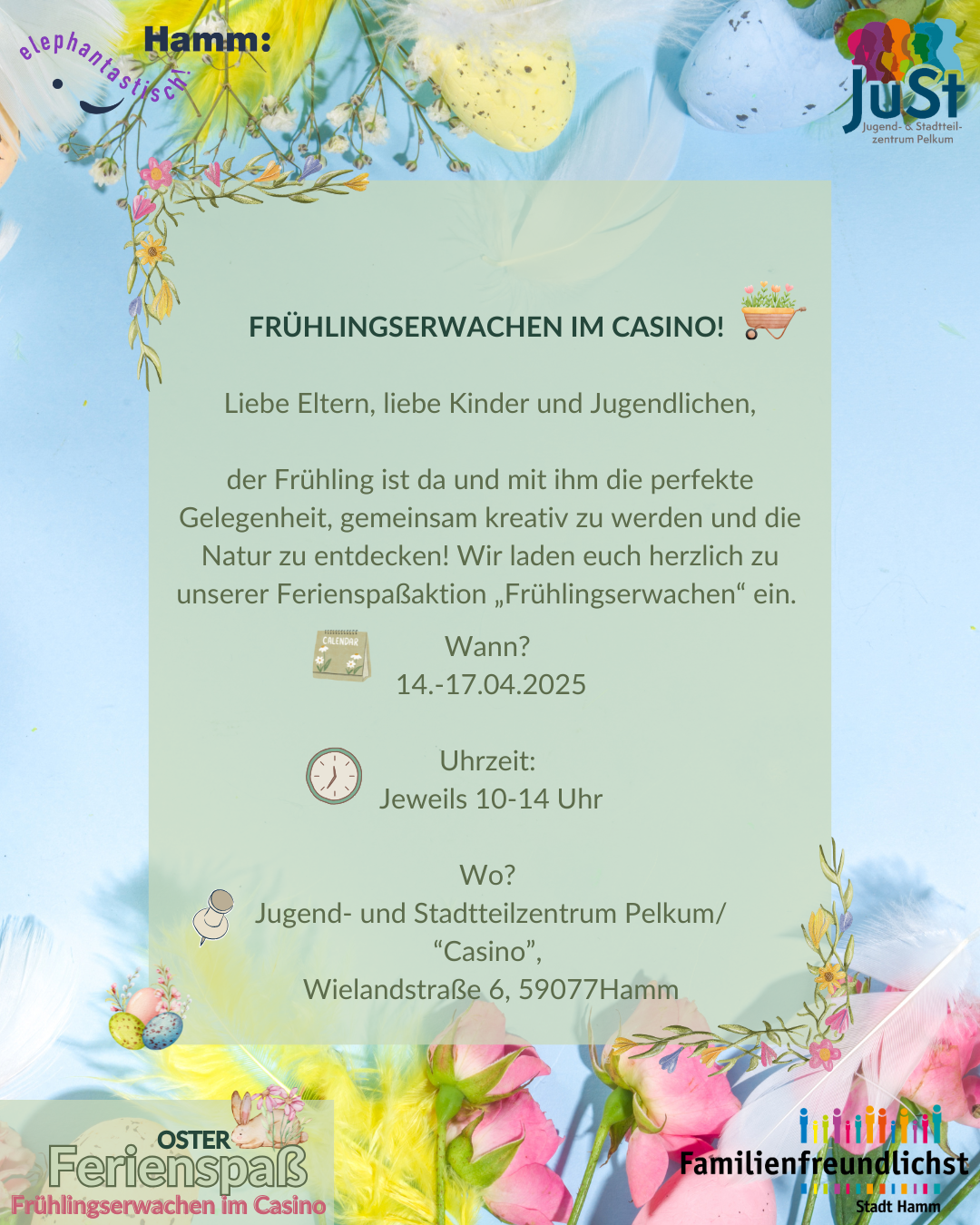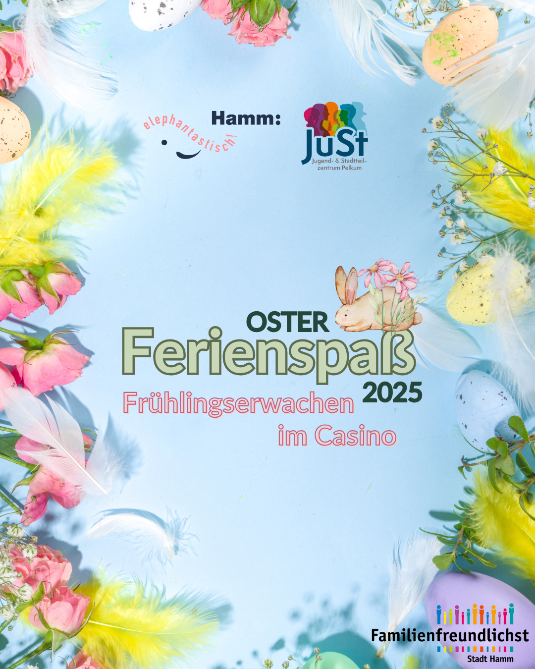 Der diesjährige Osterferienspaß im Casino findet vom 25. bis 28.03.2024 jeweils von 10 bis 14 Uhr statt. Unter dem Motto "Faire Ostern" erwarten Euch viele Kreativ- und Upcyclingangebote als auch Angebote im Außenbereich.